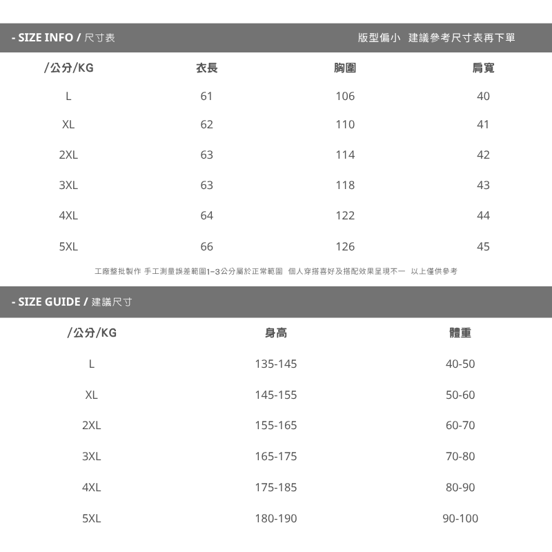 170~185cm / 75~90kg 建議穿4XL剛好 5XL微寬鬆